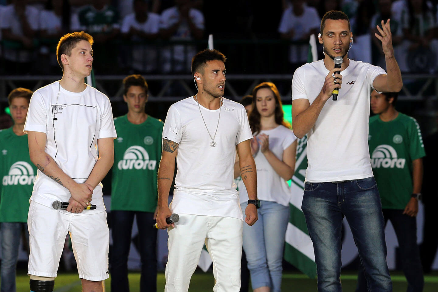 Sobreviventes da tragédia foram homenageados no jogo entre Chapecoense e Atlético Nacional de Medellín pela final da Recopa em abril de 2017