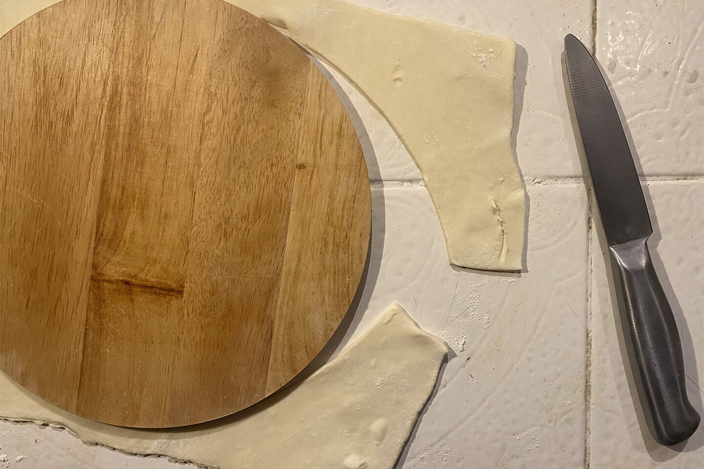 Corte o disco de massa folhada de maneira que possa cobrir as maçãs na forma. Resfrie a massa na geladeira por aproximadamente 15 minutos