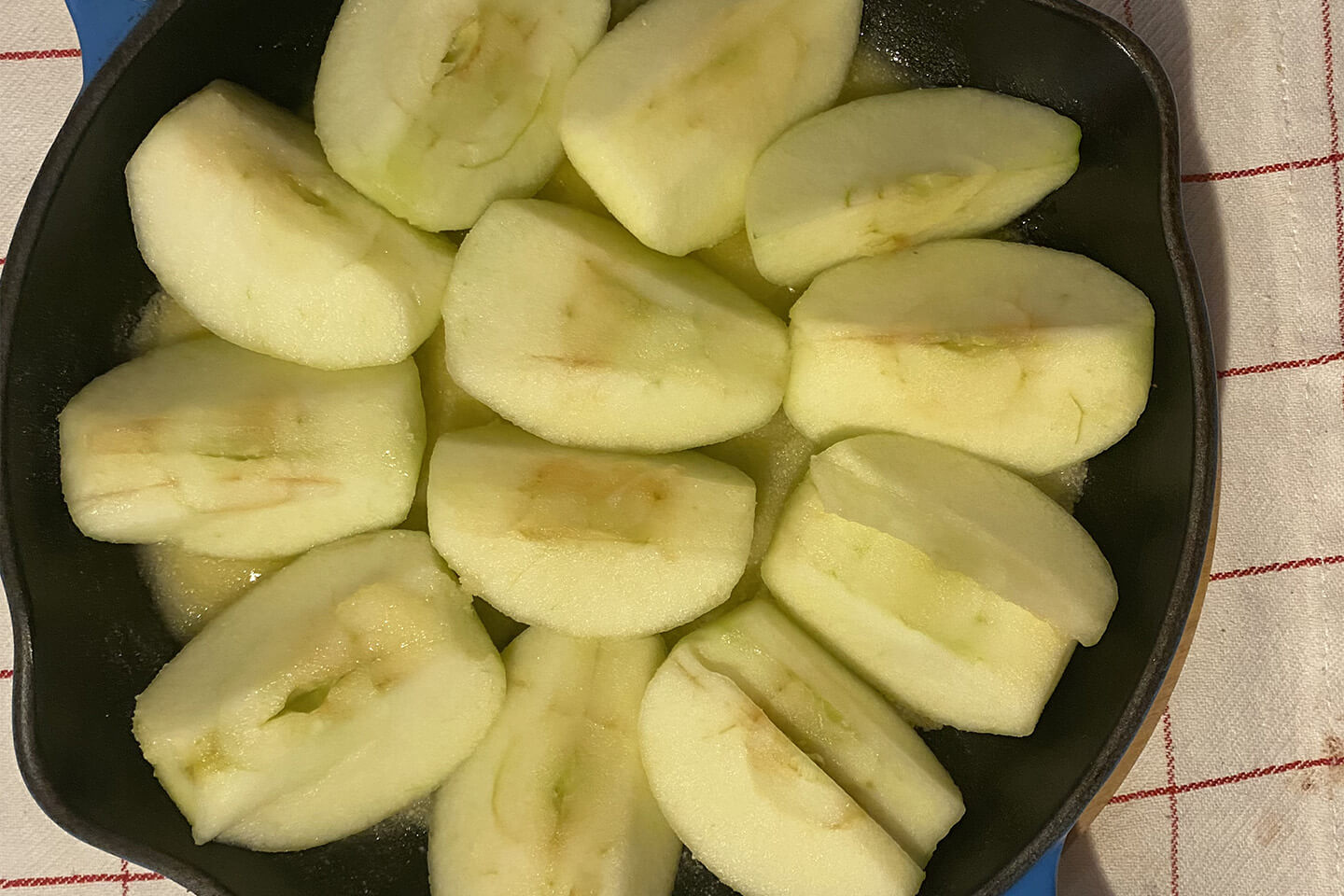 Distribua as maçãs na forma sem deixar folgas, formando uma escama, com a parte redonda virada para baixo