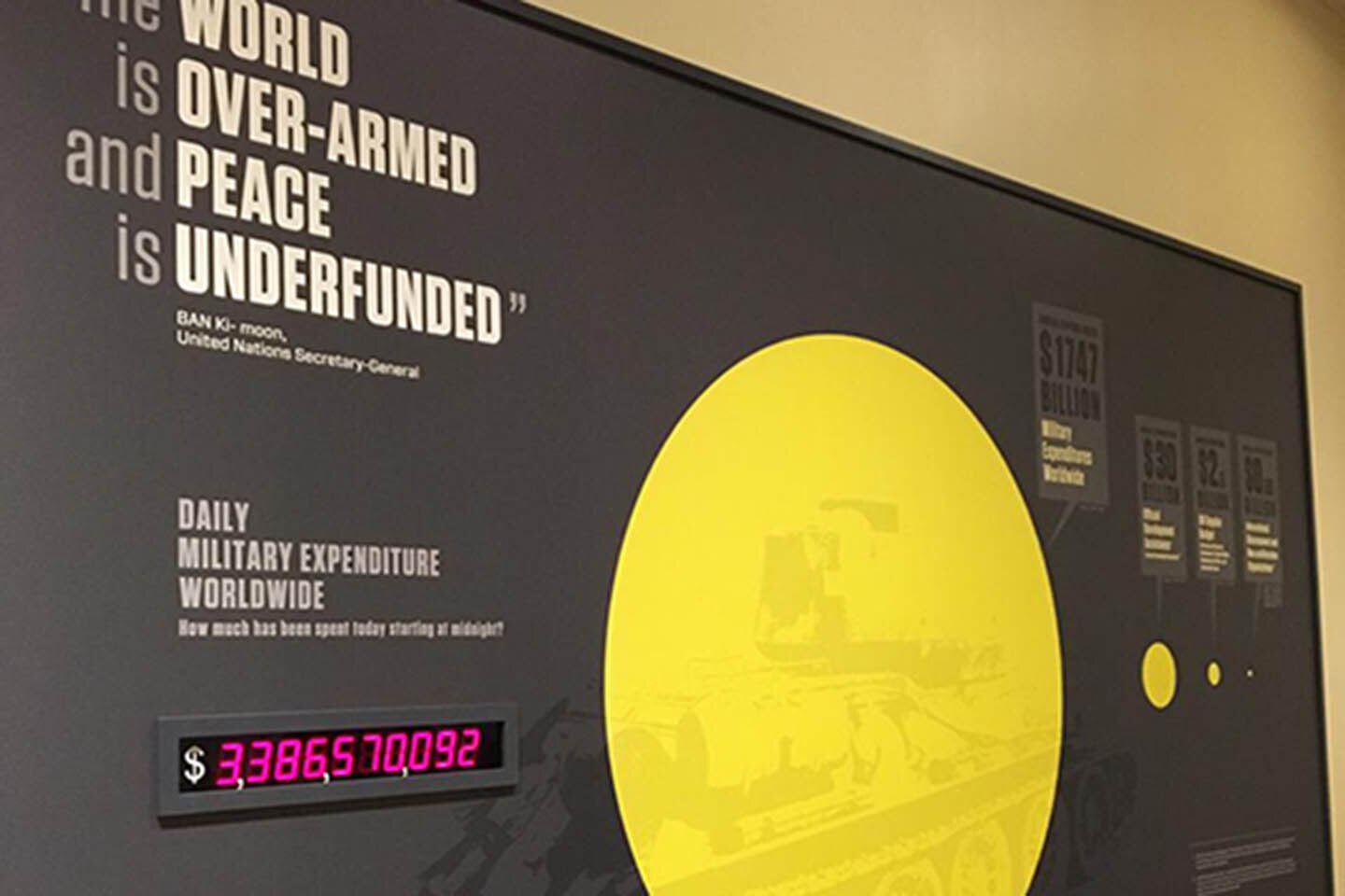 Bem próximo dali, há uma calculadora de gastos com armamentos em um dia - cerca de US$ 4 bi. Uma das principais bandeiras da ONU é a luta pelo desarmamento