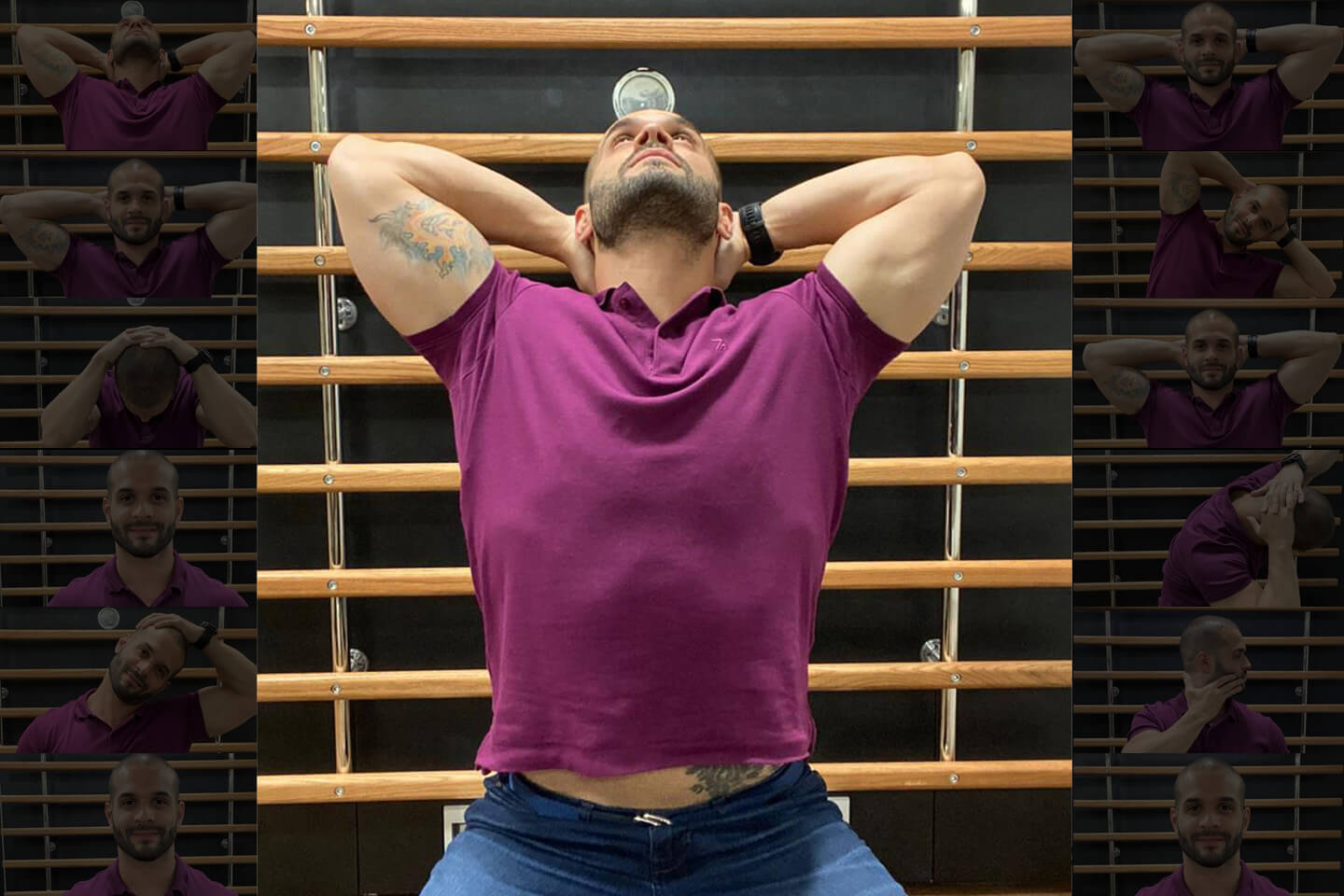 Olhe para o lado e, no final do movimento, use a mão para empurrar o queixo . Faça o mesmo movimento do outro lado. Repita 10 x