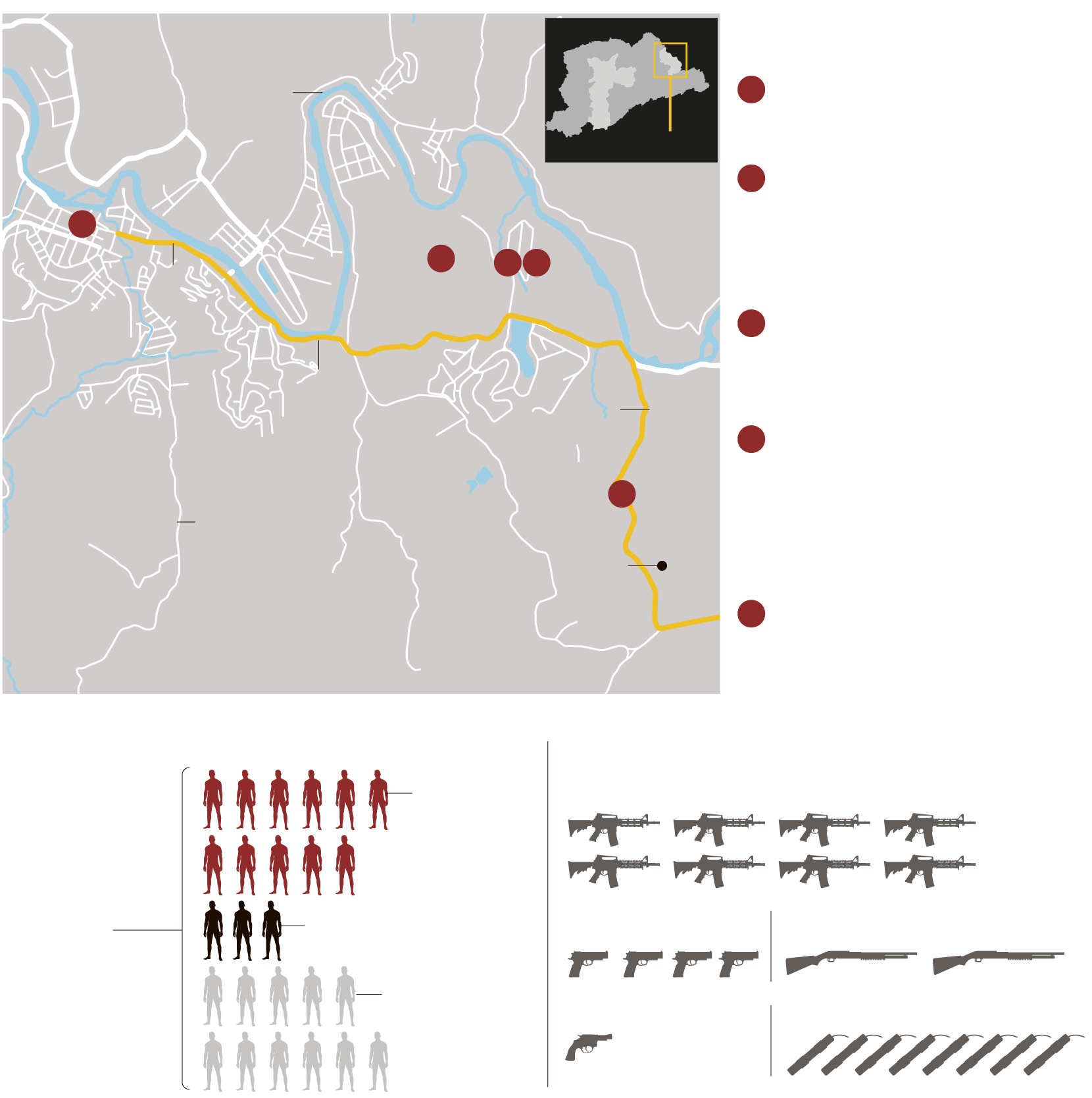 Ao se depararem com a Rota na estrada, dois veículos dão um cavalo de pau e começa o tiroteio. Sete morrem